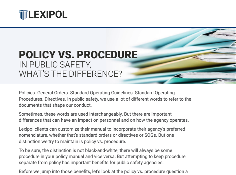Lexipol is the only all-in-one platform for public safety leaders that combines policy, training, wellness, and reporting to reduce complexity, support confident decisions, and build a culture of readiness—today and tomorrow. Learn how we can help you focus on serving—not reacting.